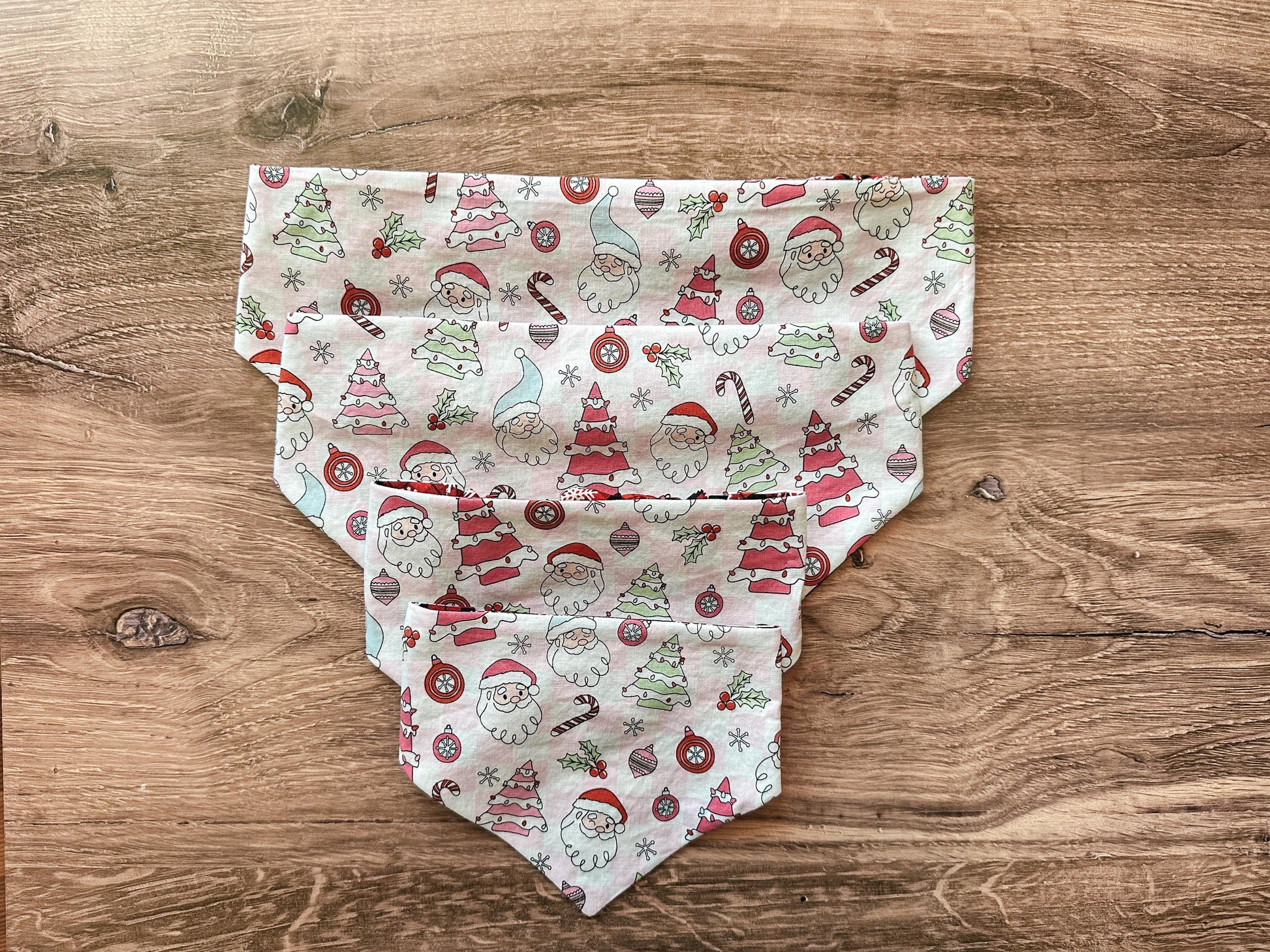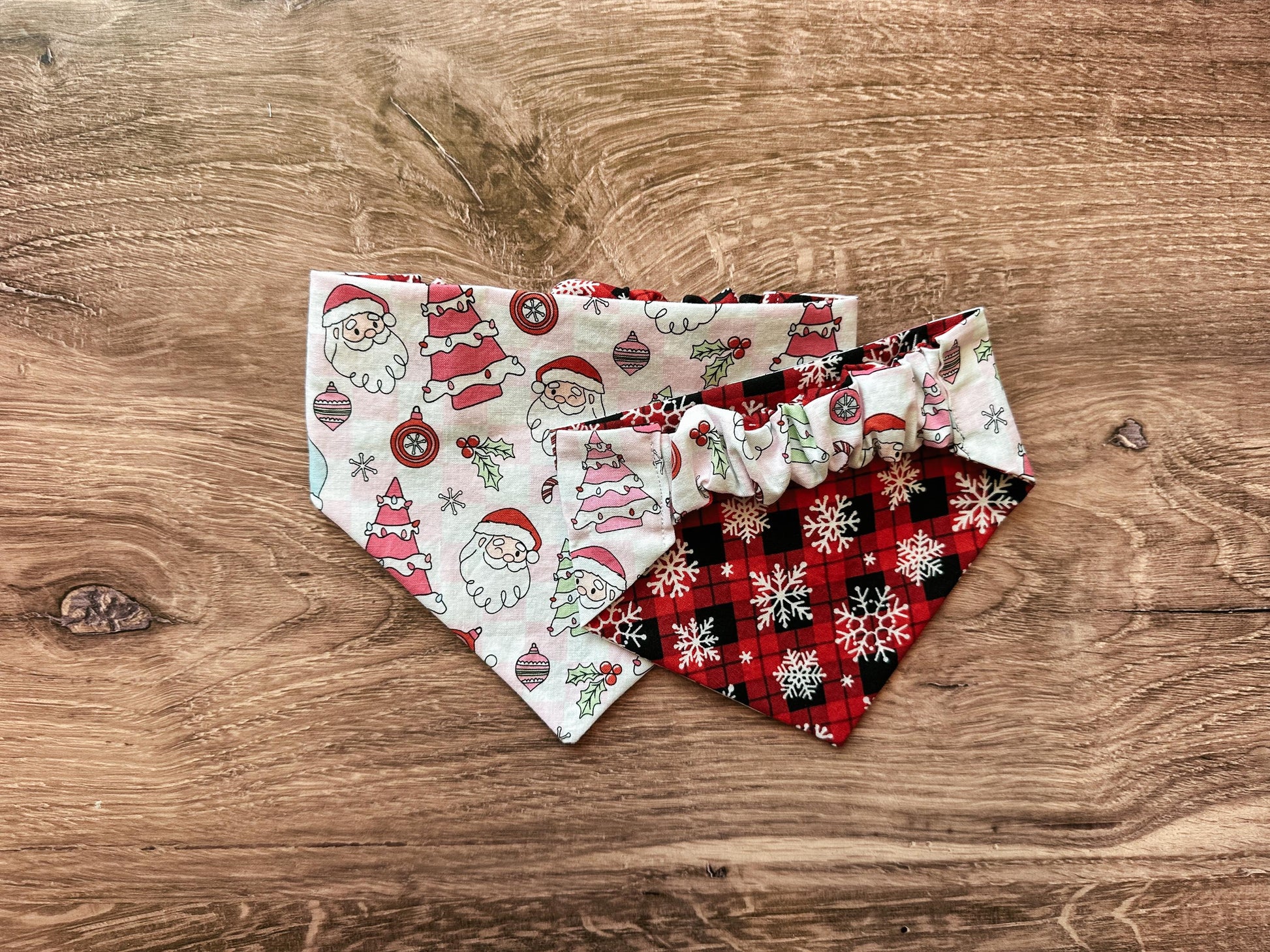 Light Pink Santa and Plaid Snowflake Holiday Reversible Scrunchie Dog Bandana