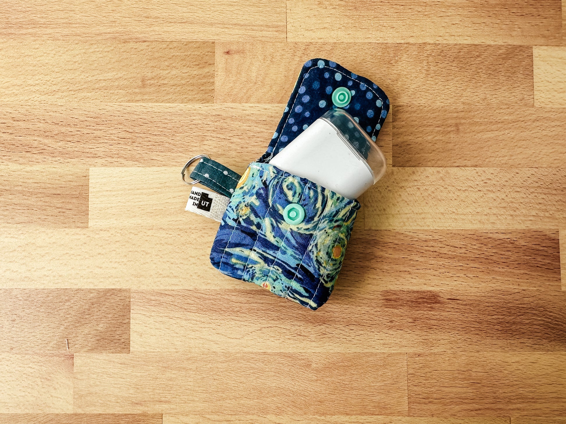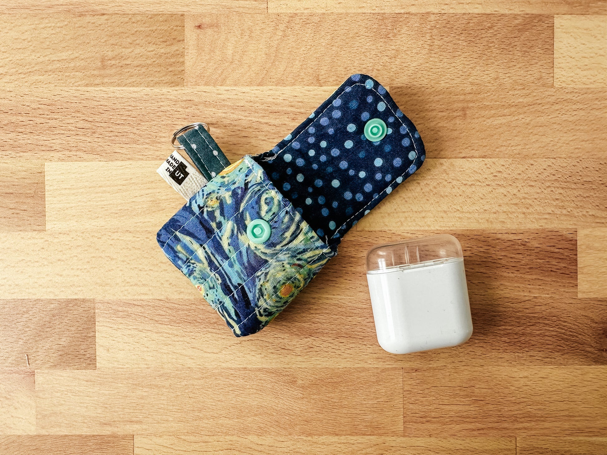 Starry Night fabric zip pouch to hold Air Pods or Small Items. Sturdy Tab has key ring to attach to clip or bag. Perfect for gym, school, travel.