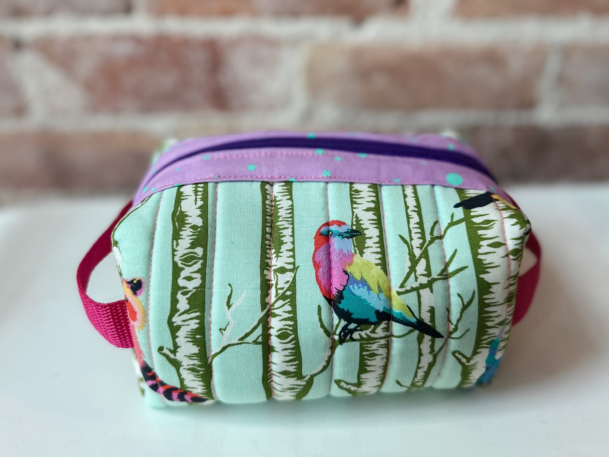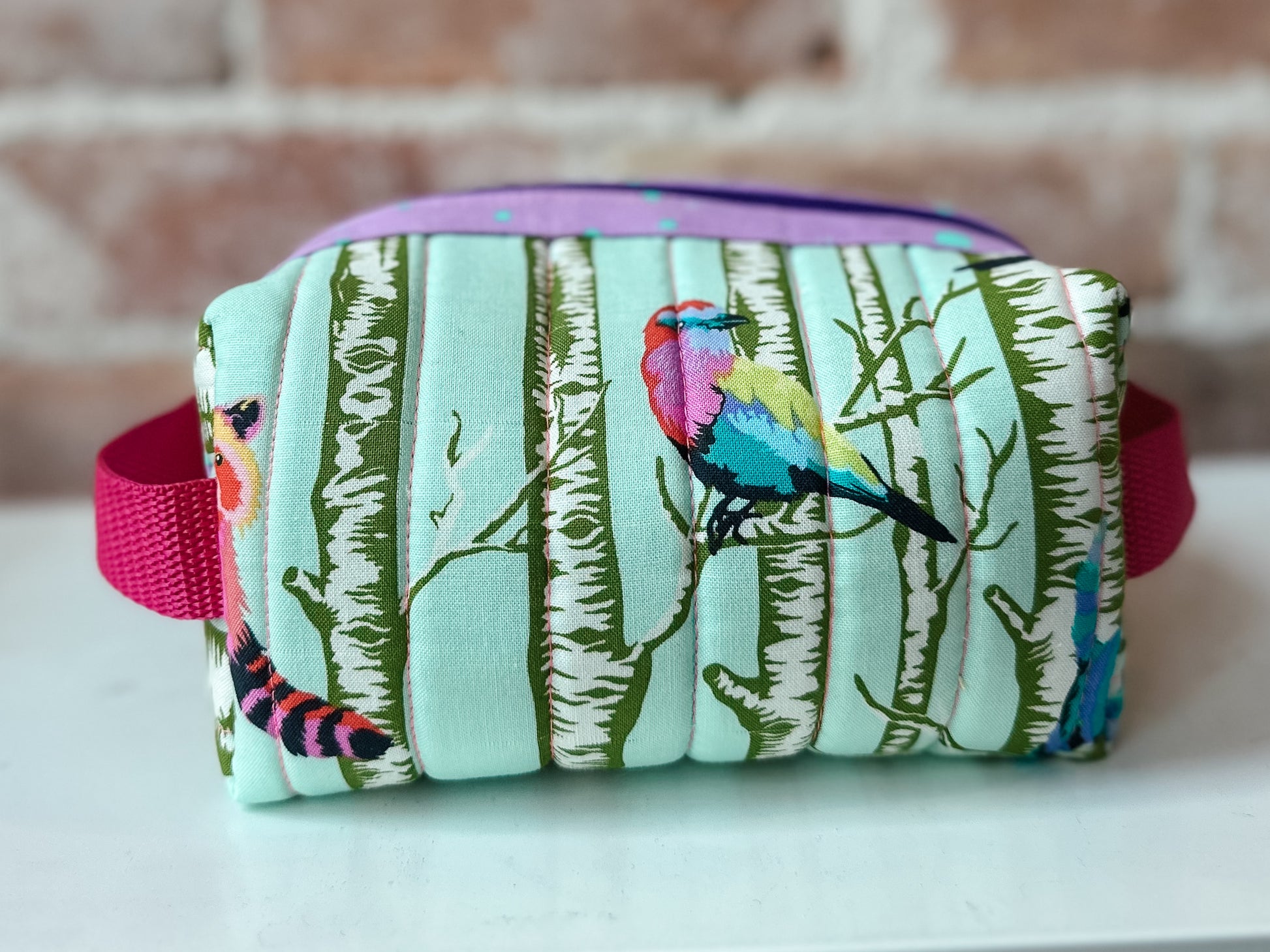 Quilted zipper bag with no raw seams. It's a great size for all your items: Tula Pink fabrics with cute creatures