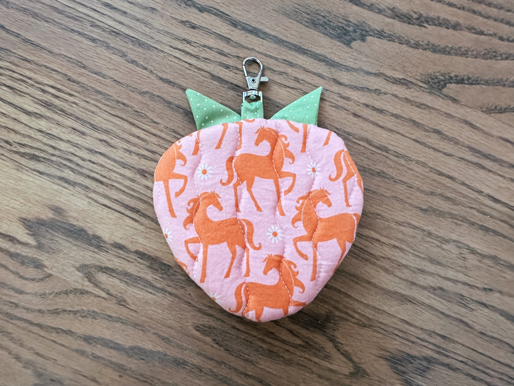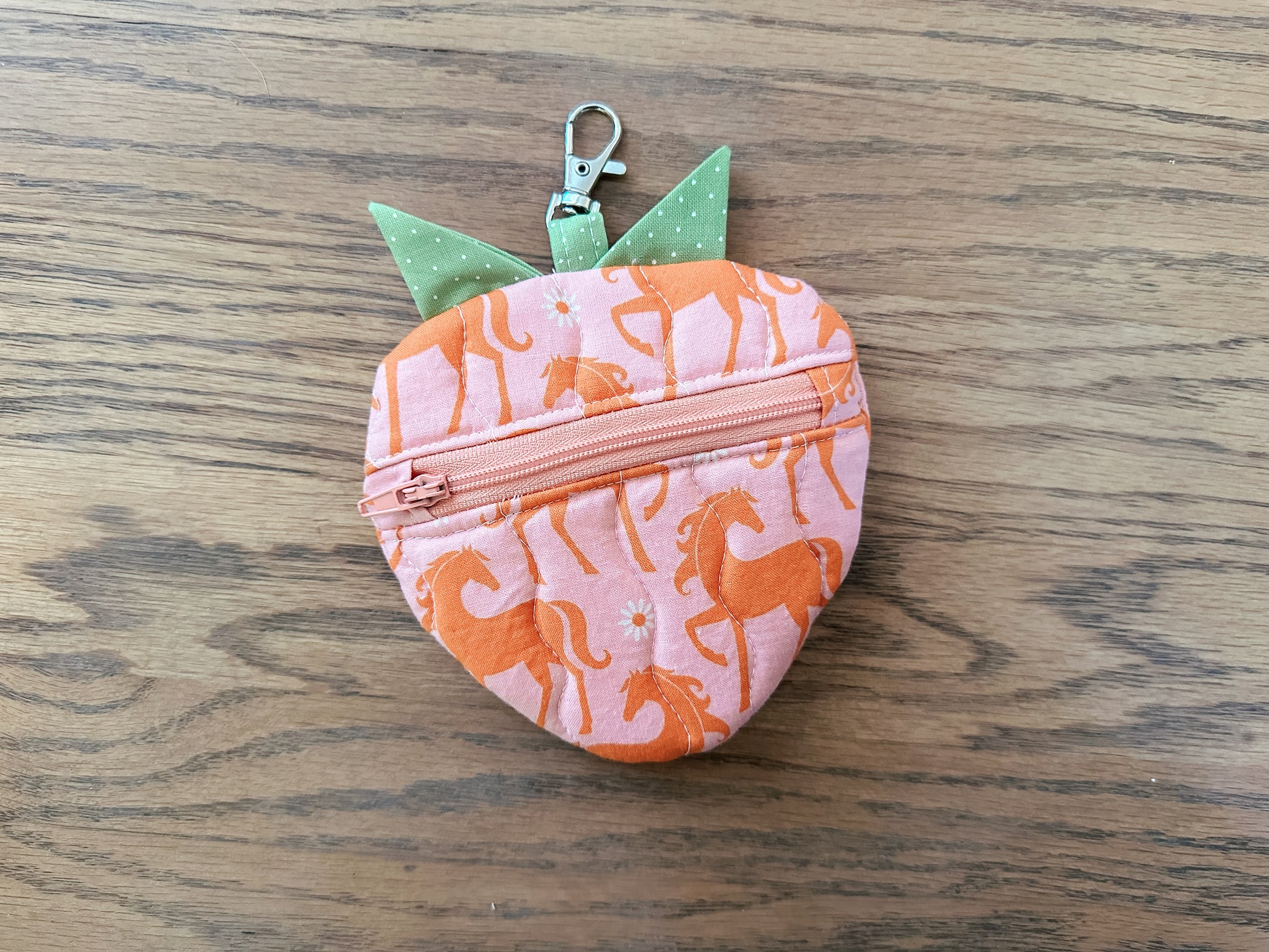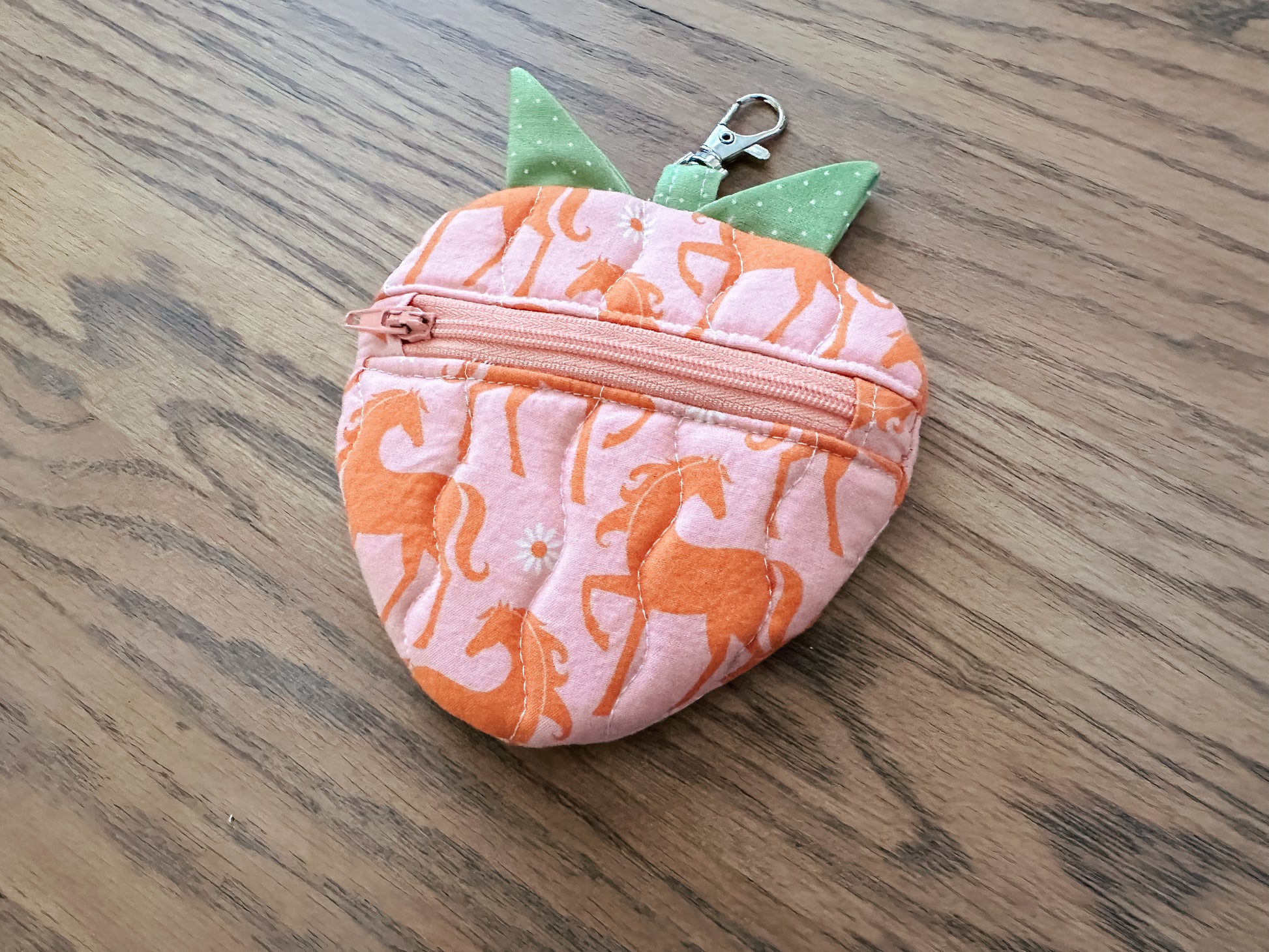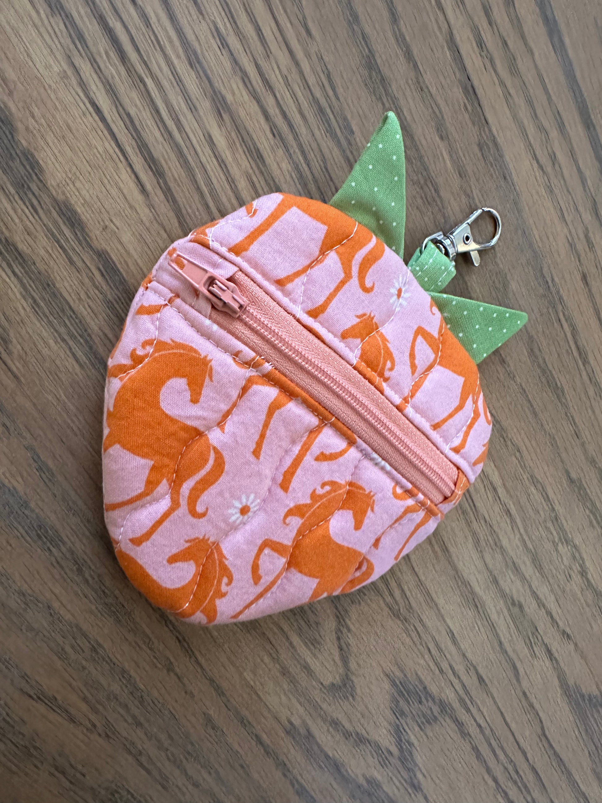 This quilted strawberry shaped coin purse is perfect for the fruit lover. It is lined with contrasting fabric and is approximately 6 x 5 inches in size.