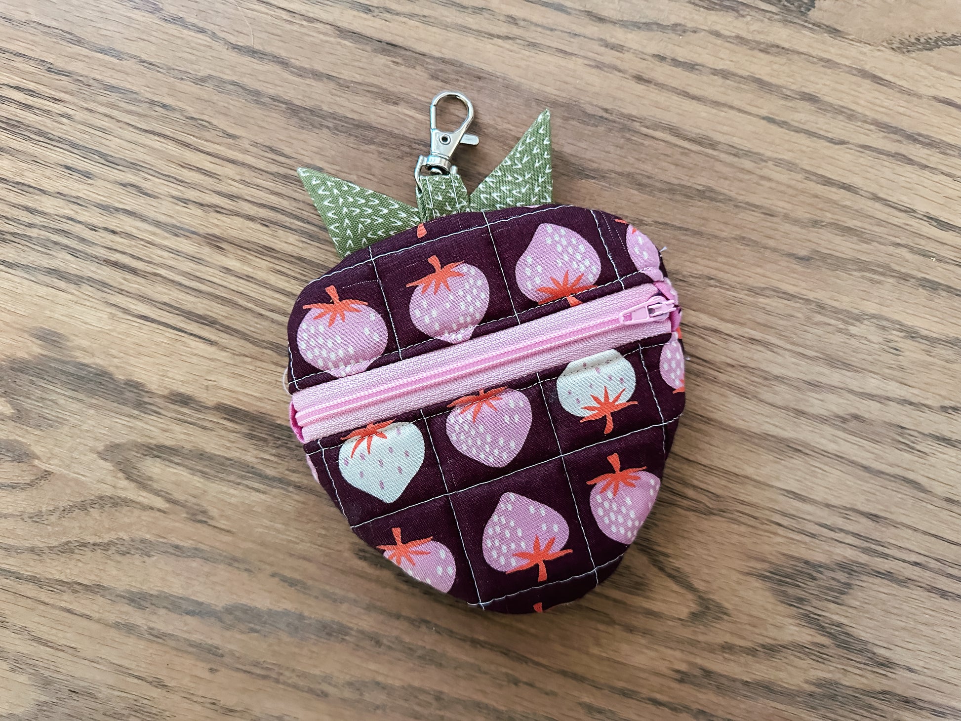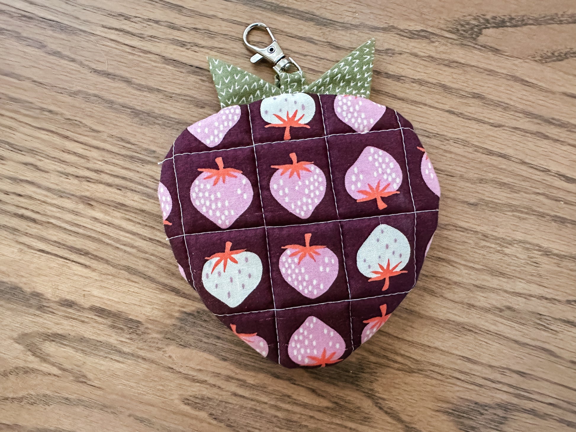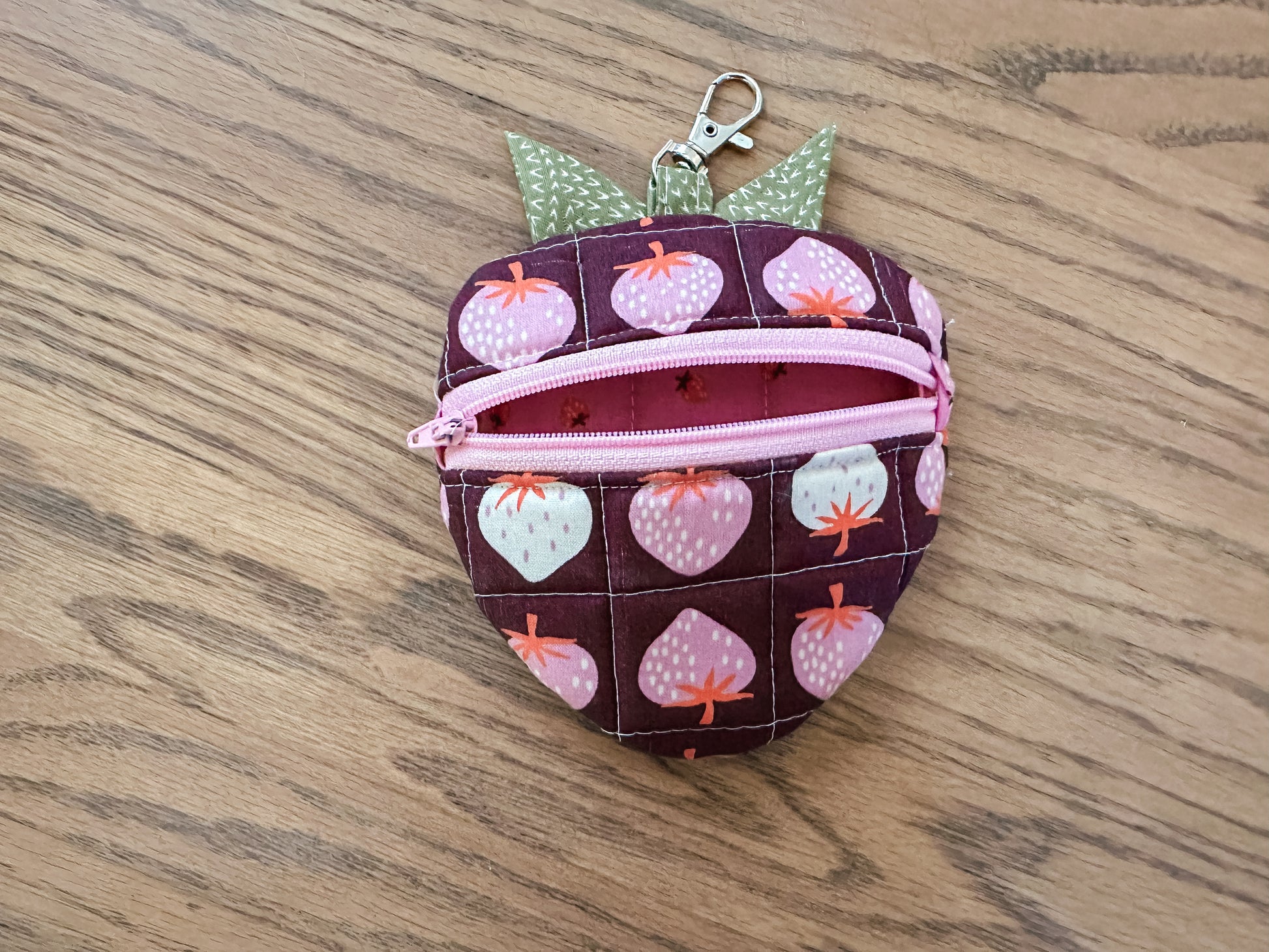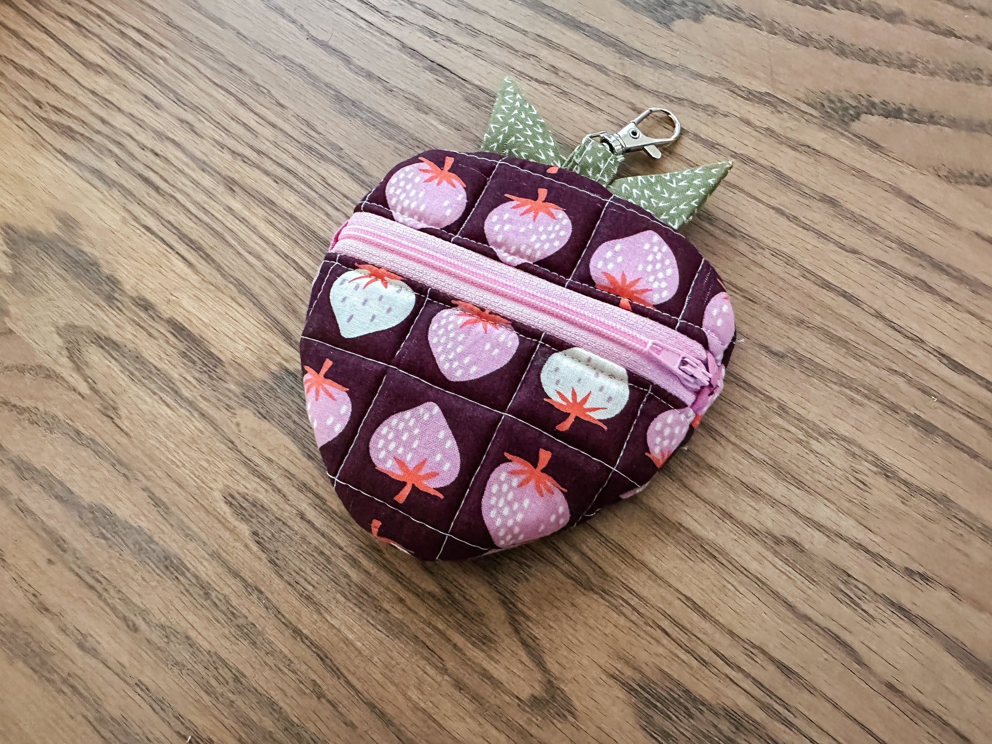 This quilted strawberry shaped coin purse is perfect for the fruit lover. It is lined with contrasting fabric and is approximately 6 x 5 inches in size.
